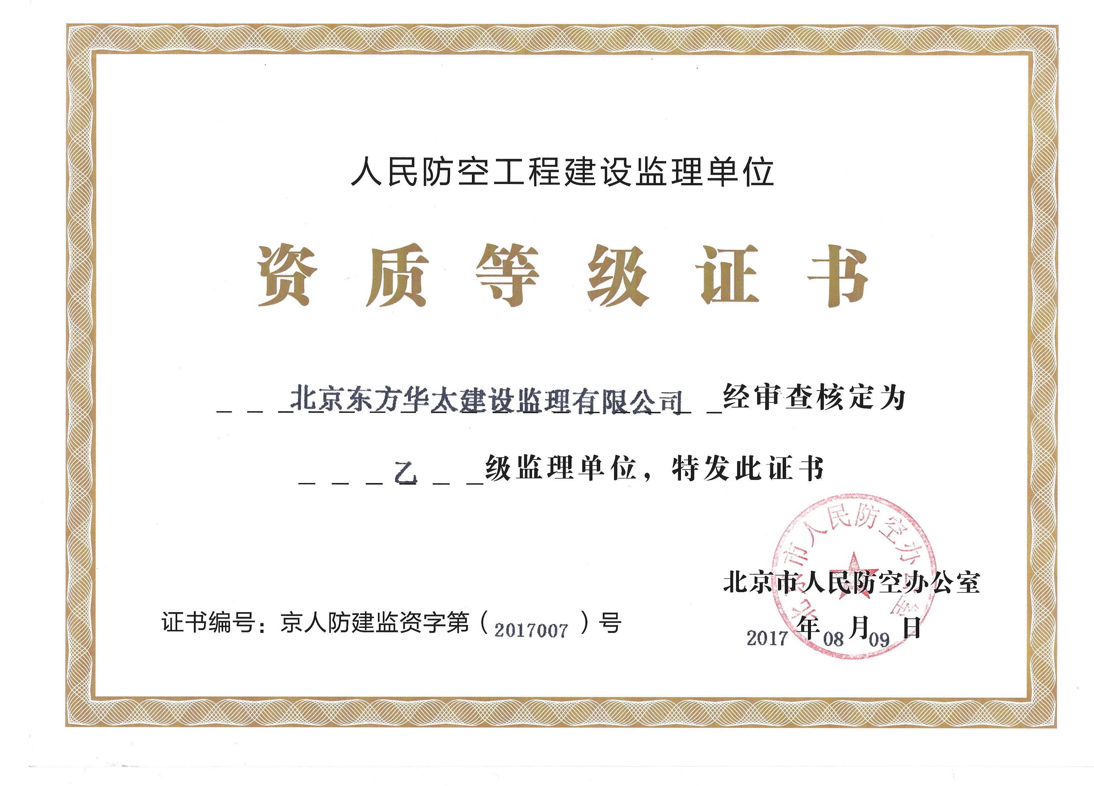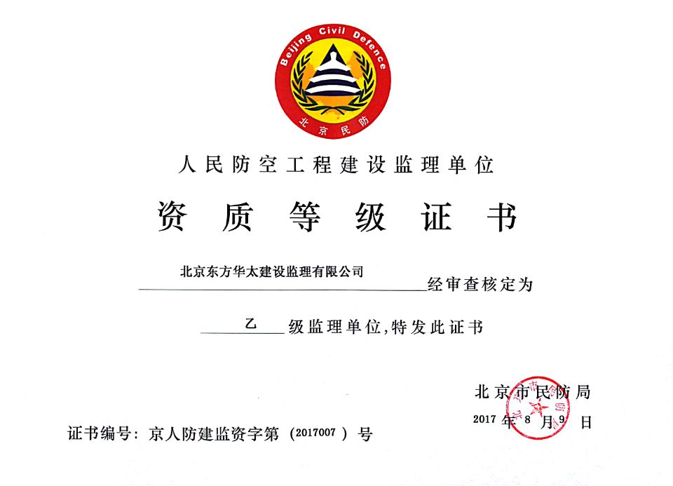 人民防空工程建設(shè)乙級監(jiān)理單位證書